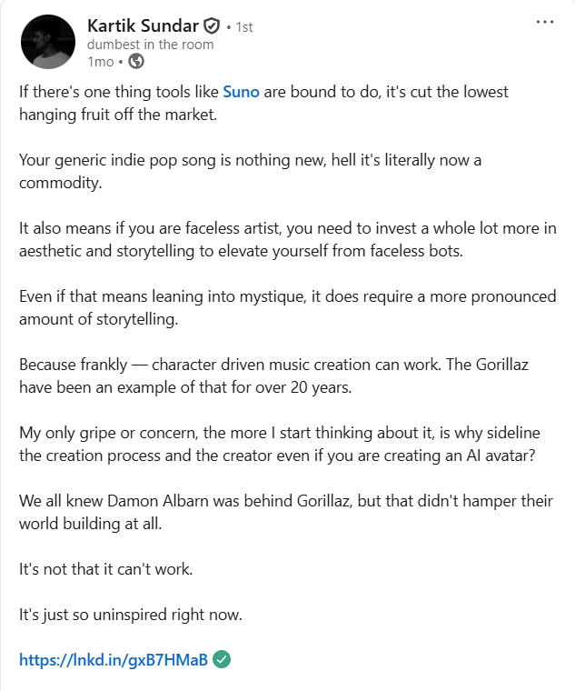 And this is going to be even more painful in the AI age, where the pop song faces further devaluation. Platforms like Suno will swing the pendulum in the opposite direction — where being authentic matters more than ever. For the record, we’re seeing this exact pendulum swing in the writing field.