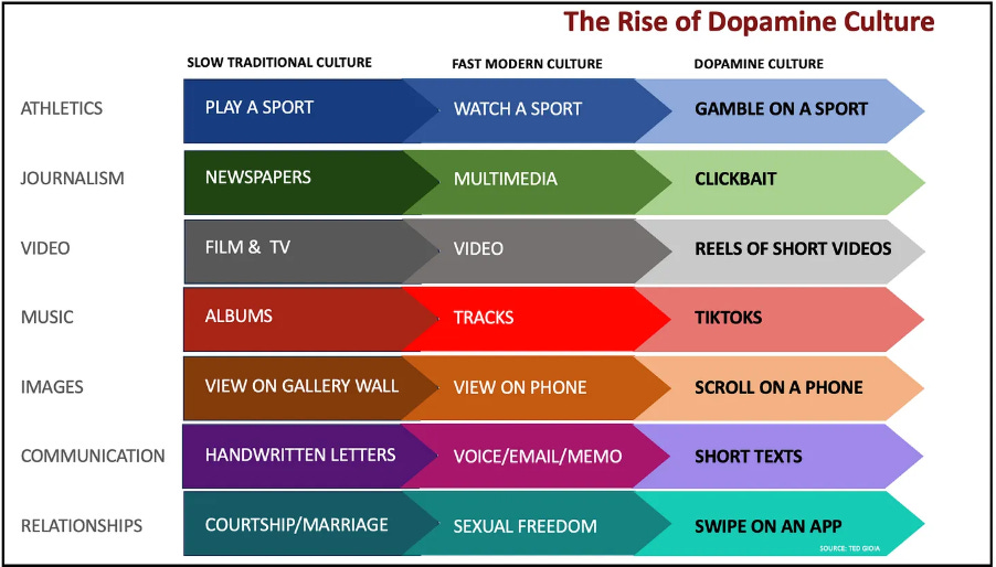 Obviously, while enabling the marketing layer further, social media has amplified this problem I’ve mentioned above to an unfathomable degree. You may have read Ted Gioia’s wonderful (and scary) piece on enshittification and dopamine culture. And you’ve probably seen this chart of his.