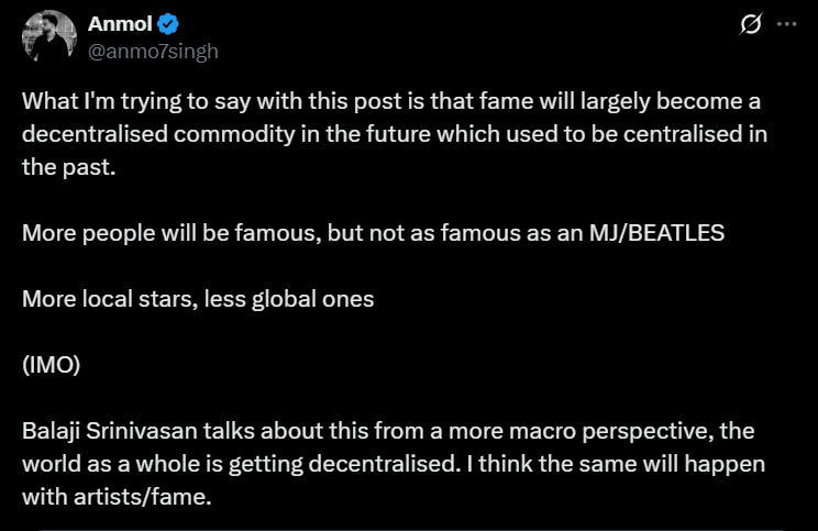 Second is a trend that music industry professionals have been keenly watching (see the tweet screenshot below). The product differentiation so inherent to music has been translating to a more natural outcome — that of niche fandoms. The end state that many project for this is that the future of music won’t be marked by a few superstars at the top (as has been the case for long), but many mid-tier stars who have sizeable (but not Taylor Swift-level) fanbases. The end state may not be as strong, but it’s certainly headed there, and it’s partly because of the type of commodity music is.