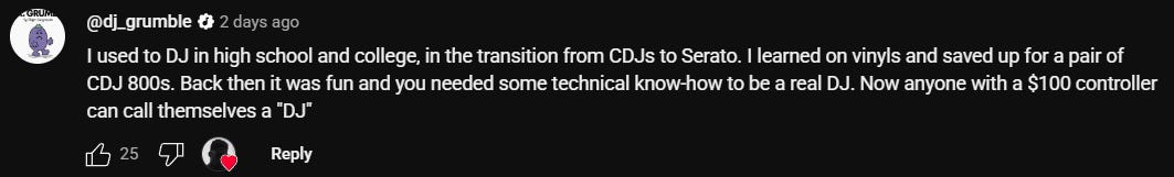 This is also why I don’t get the complaint of there being too many DJs. That every cheeky bugger with a $100 console is calling themselves a DJ. My answer is: let them? DJ technology dropped the cost curve for DJing for so many people, that you could do without buying expensive vinyl sets to start doing some sweet transitions. Like, this YouTube comment doesn’t sit well with me.