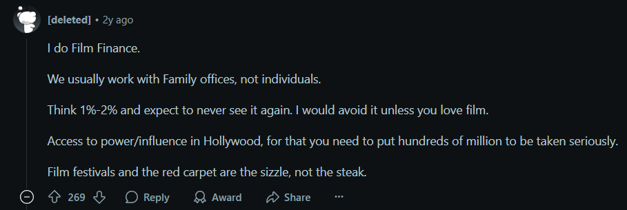 I found this fun comment on Reddit about investing in film, which emphasized that success hinged primarily on loving films. I expect funds to come to a similar realization about club gigs and music festivals — that why people love a certain piece of music or film matters a lot to any business model in the entertainment industry.
